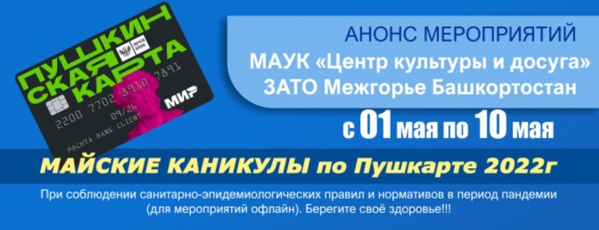 Дорогие жители и гости ЗАТО Межгорье! Приглашаем провести майские выходные в наших учреждениях культуры.Предлагаем вашему вниманию топ идей, как провести майские праздники с Пушкинской картой.
