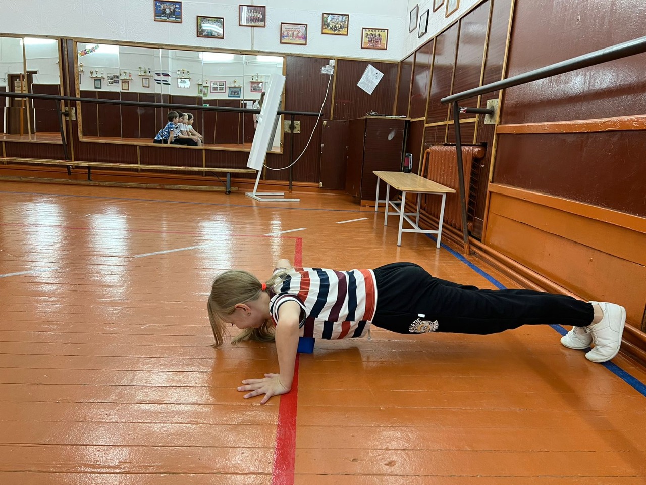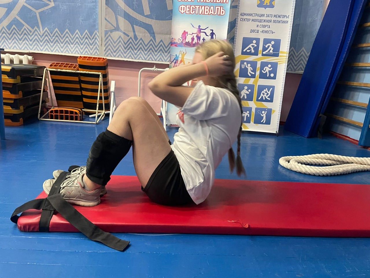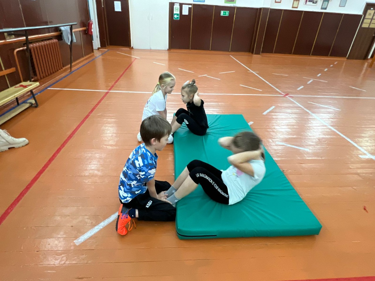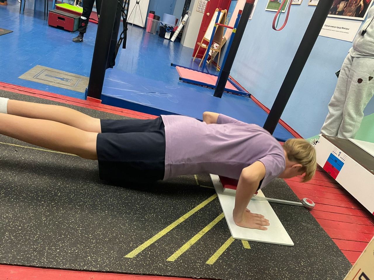Юные спортсмены выполнили такие нормативы, как сгибание и разгибание рук в упоре лёжа на полу, поднимание туловища из положения лежа на спине, прыжок в длину с места и наклон вперёд из положения стоя на гимнастической скамье.